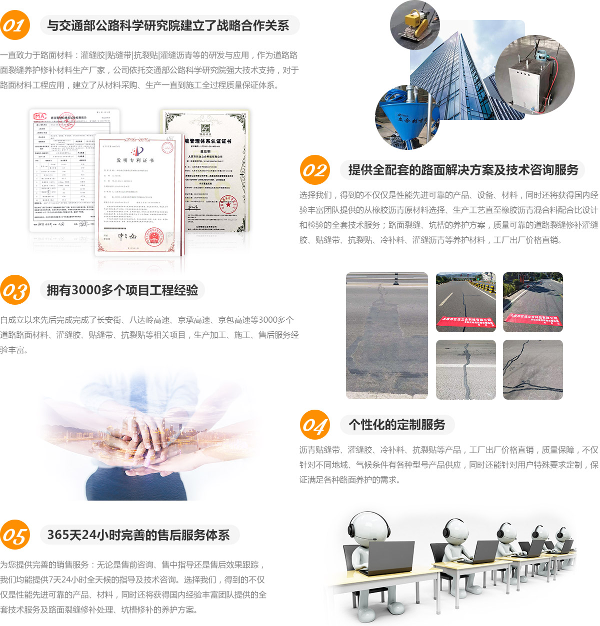 無損傷裂縫處理,無需開槽。產(chǎn)品經(jīng)車輛自行碾壓后,縫內(nèi)材料充實度,飽滿度狀況良好,同時可加強裂縫周邊的強度。